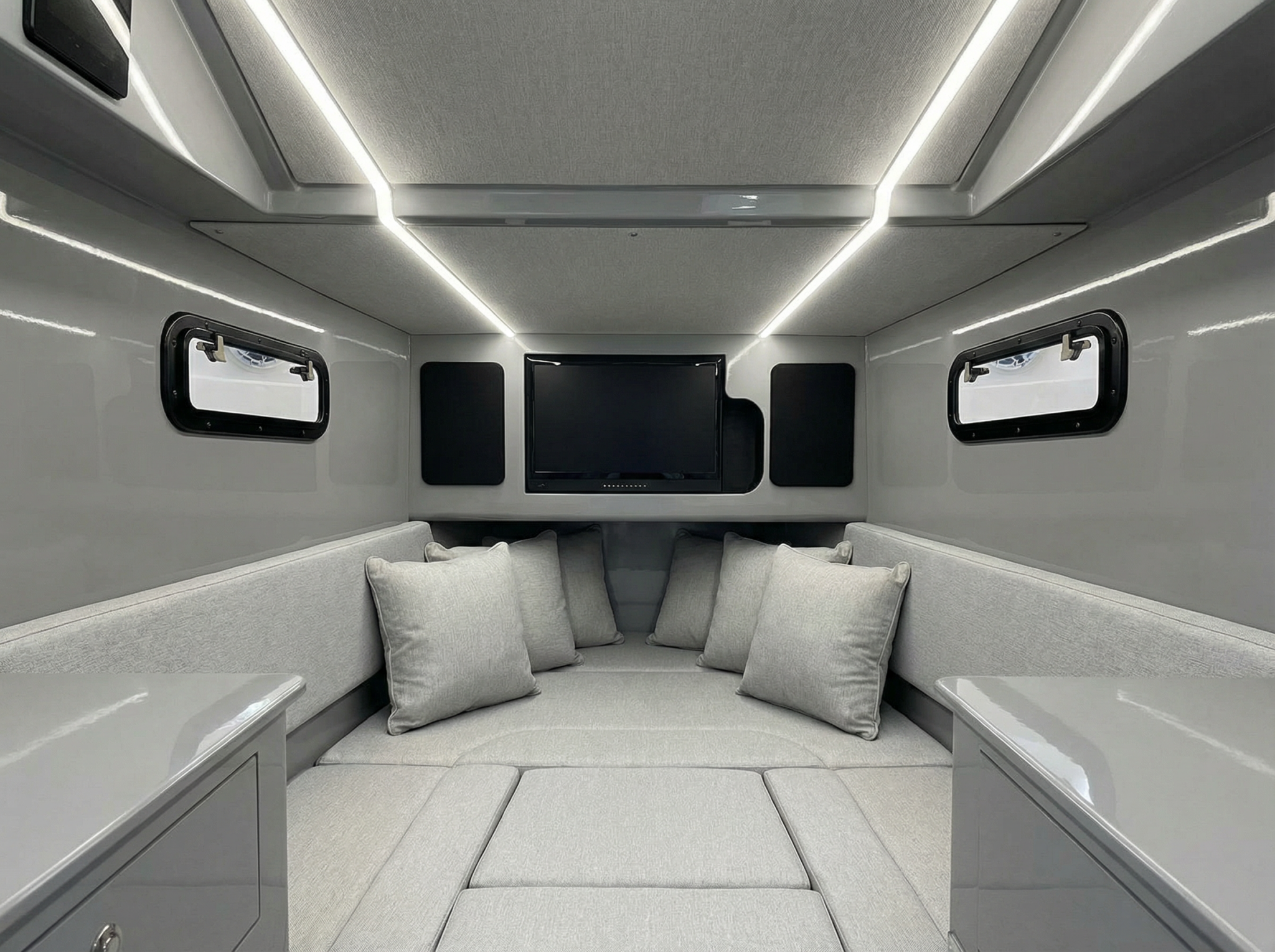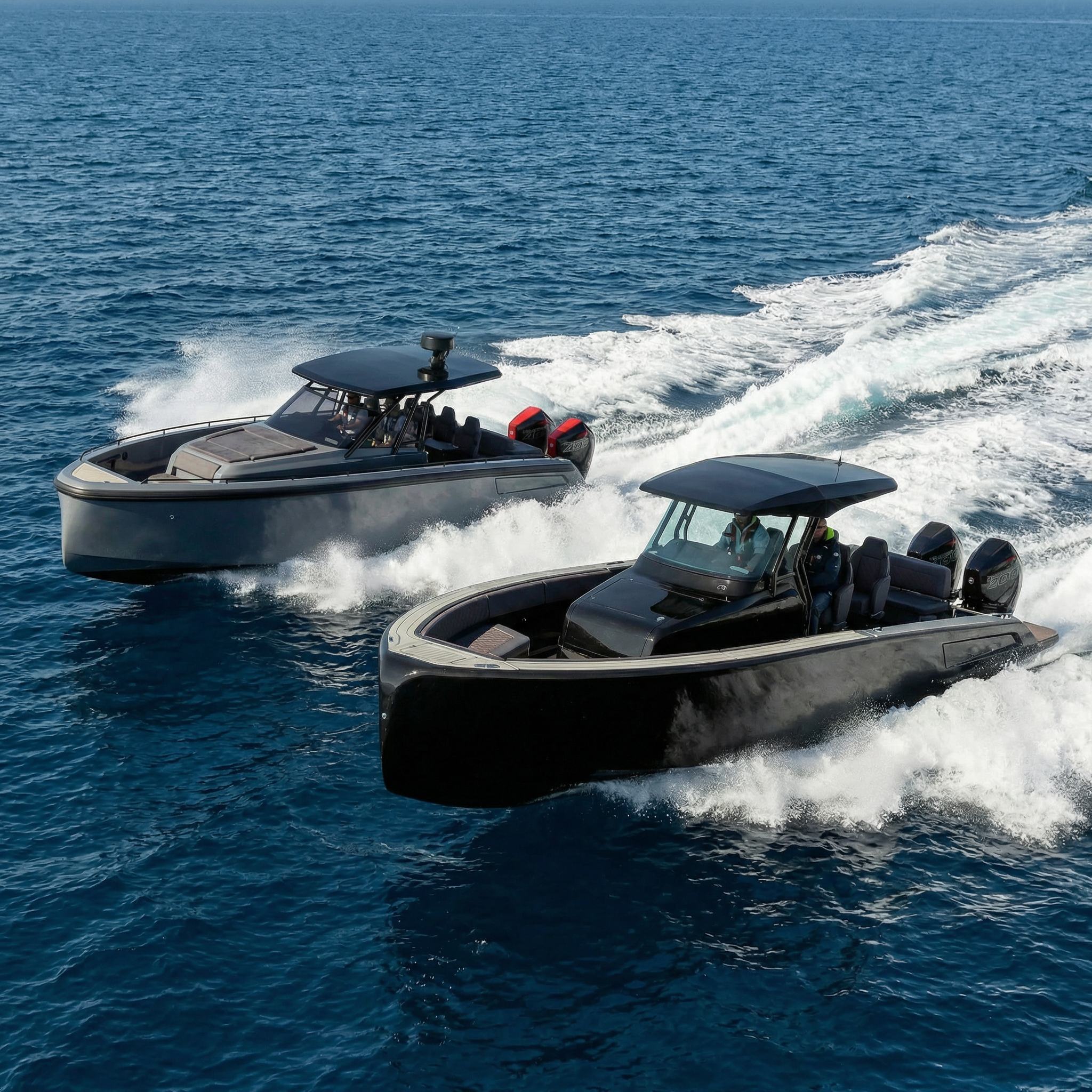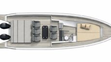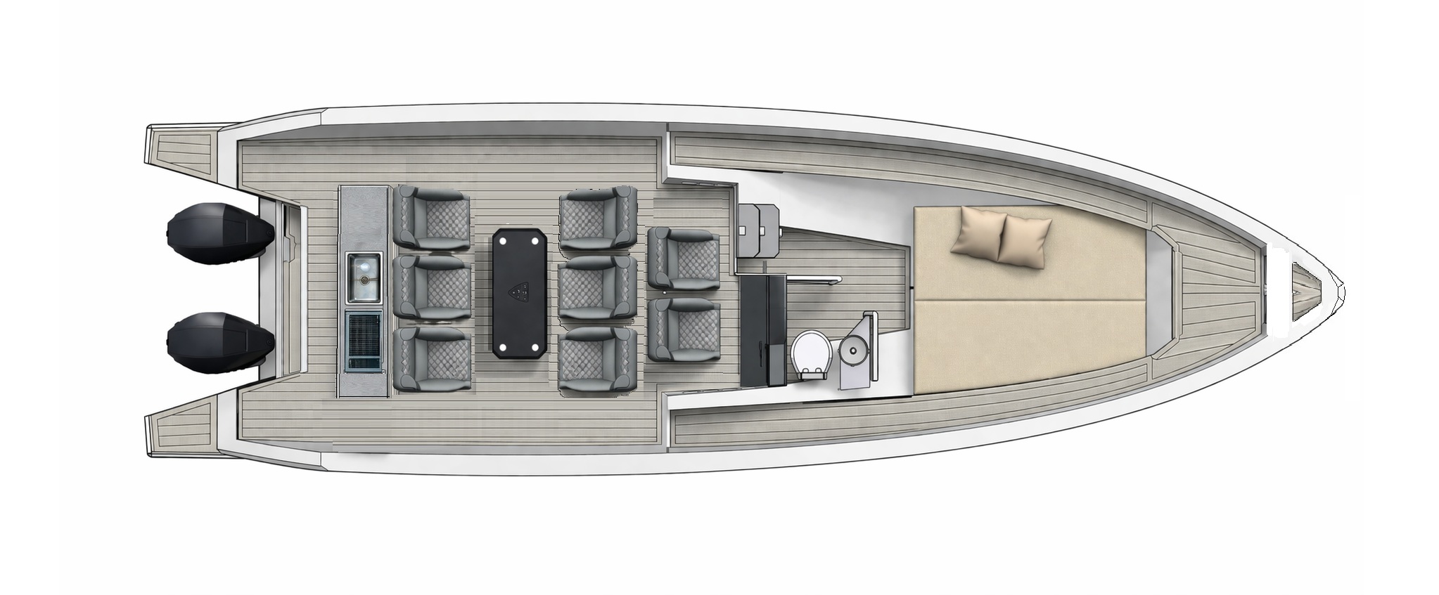 Performance can be tailored by choosing from twin Mercury V8-300 or V10-425 engines, ensuring the desired balance between acceleration, top speed, and cruising efficiency. Various deck layout options further allow the vessel to be optimized according to owner preferences—whether focused on sporty driving, social day cruising, or relaxed time spent at sea.