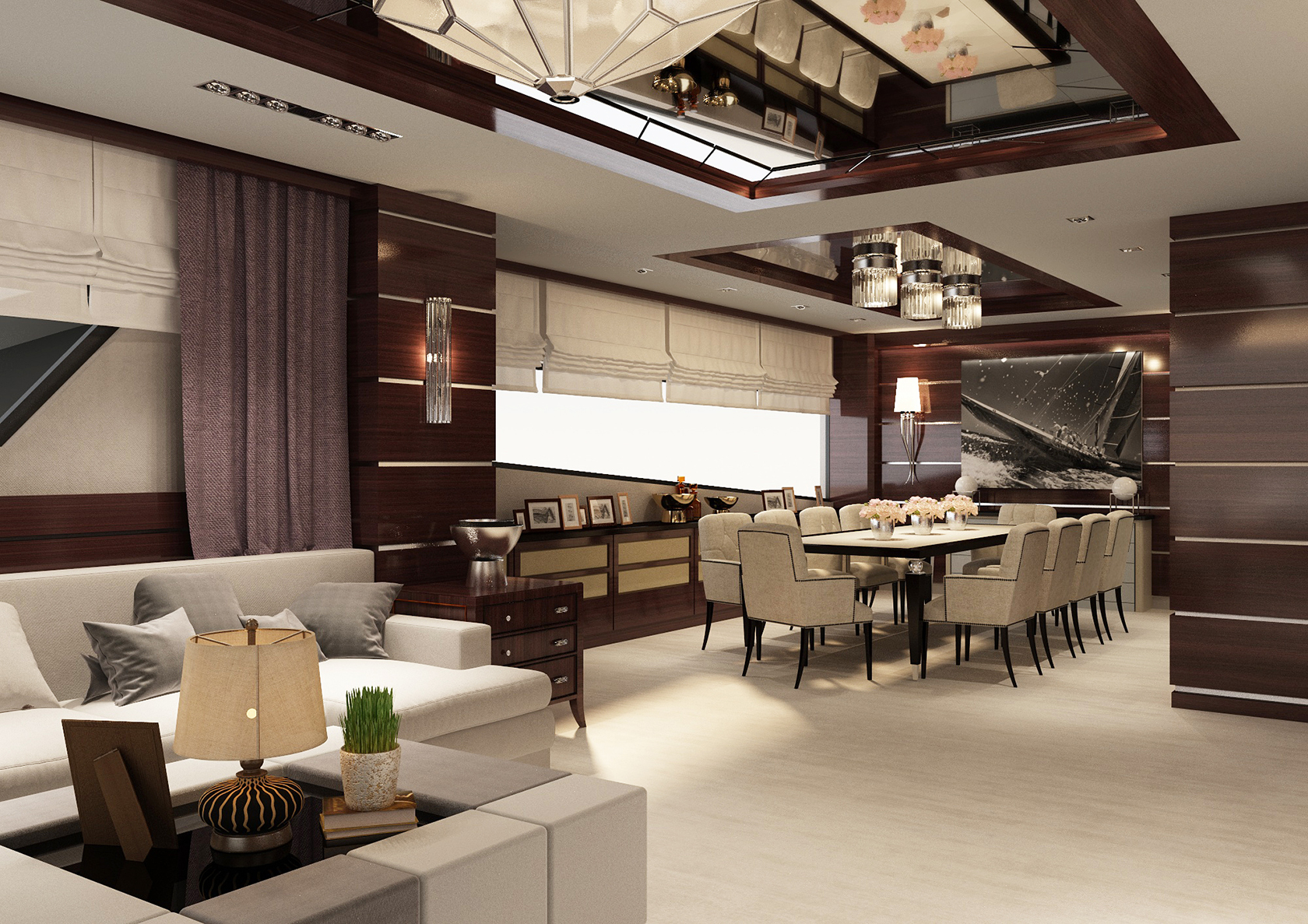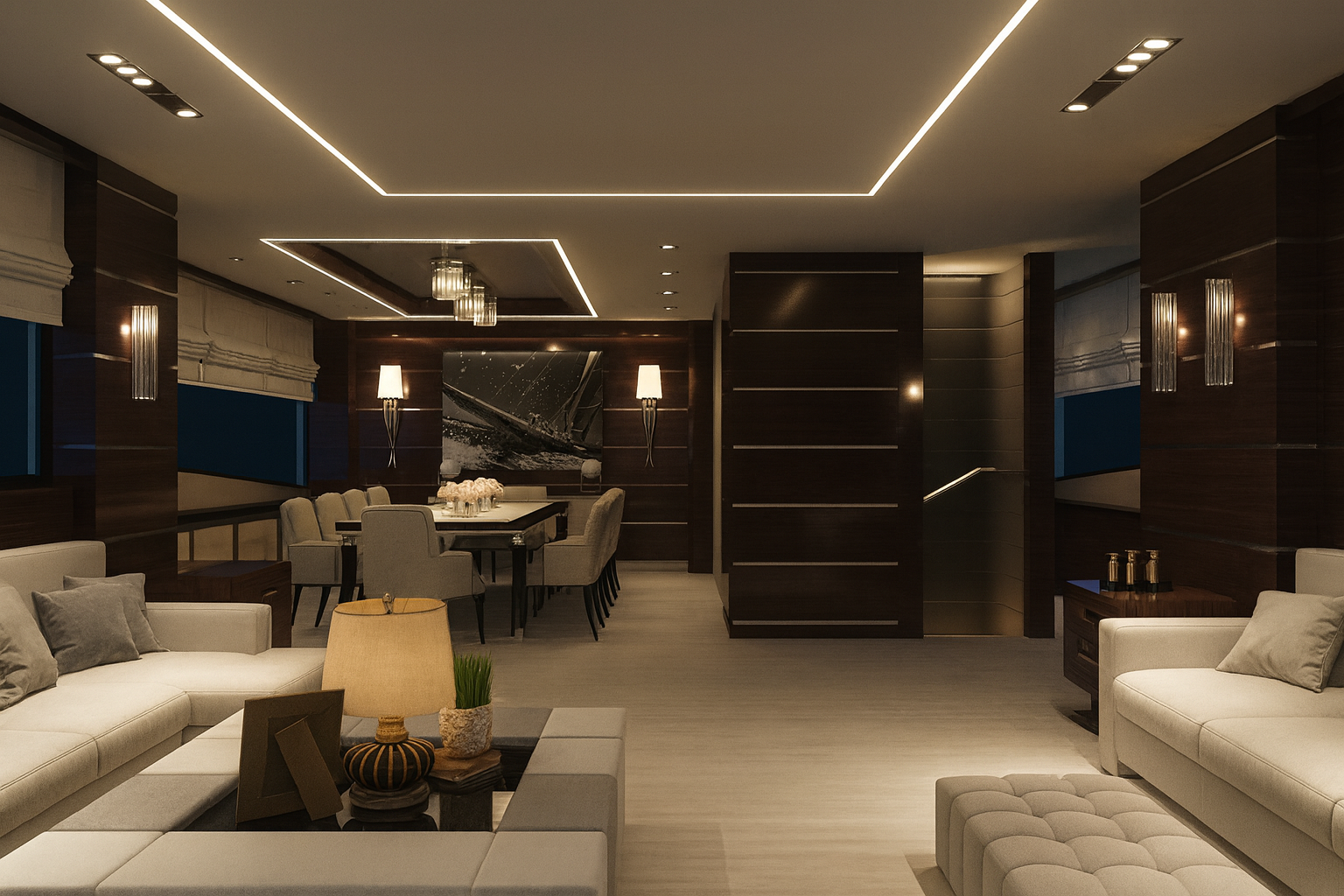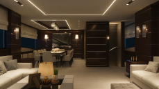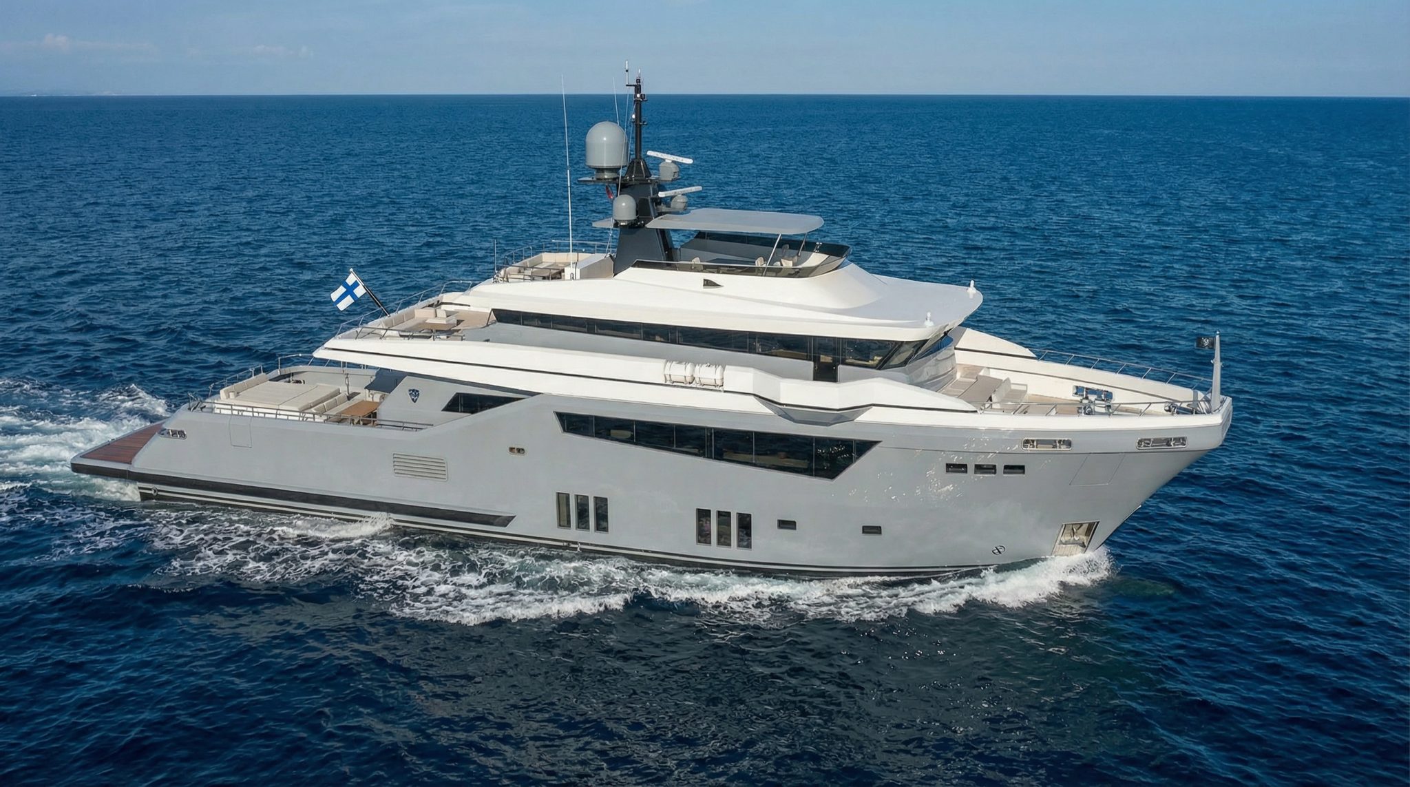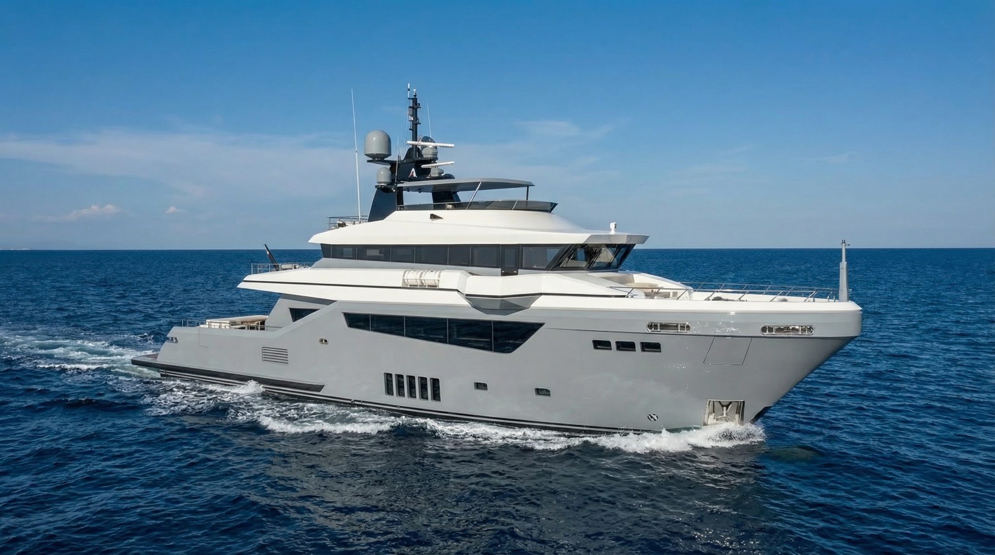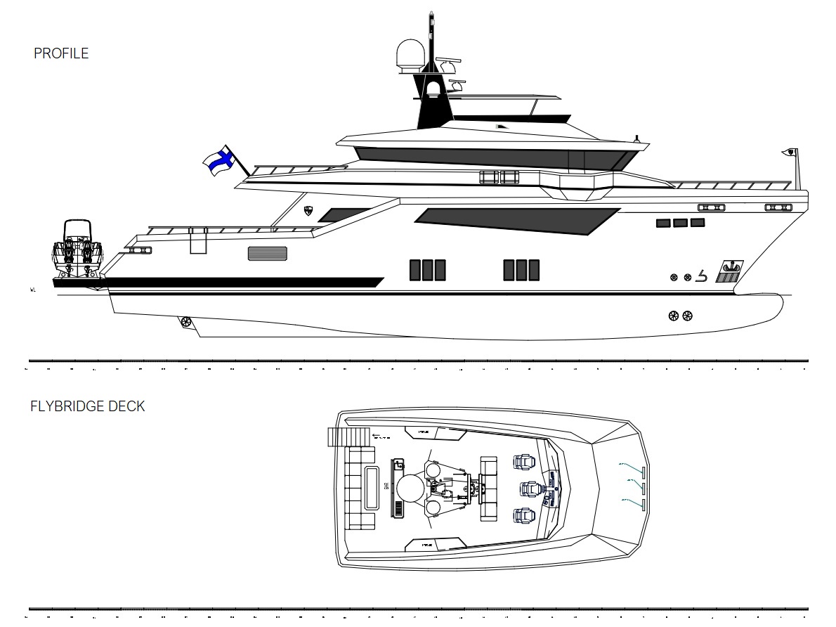 The large saloon serves as the social heart of the yacht, seamlessly connected to expansive exterior areas designed for relaxation, sunbathing, and enjoying life at sea while underway. Generous sundeck and flybridge spaces provide panoramic visibility and multiple living zones, enhancing both comfort and operational awareness during long voyages. Integrated docking wings on both port and starboard sides further improve maneuverability, ensuring safe and controlled handling at all times.